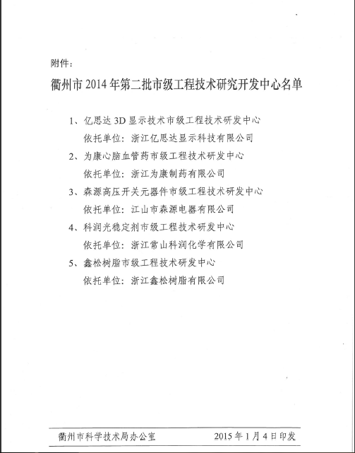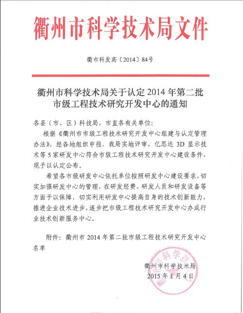 隨著公司技術(shù)創(chuàng)新能力的不斷增強(qiáng)和技術(shù)研發(fā)體系的逐步完善,公司在產(chǎn)品生產(chǎn)、質(zhì)量控制和新產(chǎn)品開發(fā)方面的能力得到國(guó)家科技部門的極大認(rèn)可。2014年公司在科技創(chuàng)新工作方面取得可喜的成績(jī),公司被認(rèn)定為國(guó)家高新技術(shù)企業(yè),企業(yè)技術(shù)中心也被認(rèn)定為衢州市市級(jí)研究開發(fā)中心。