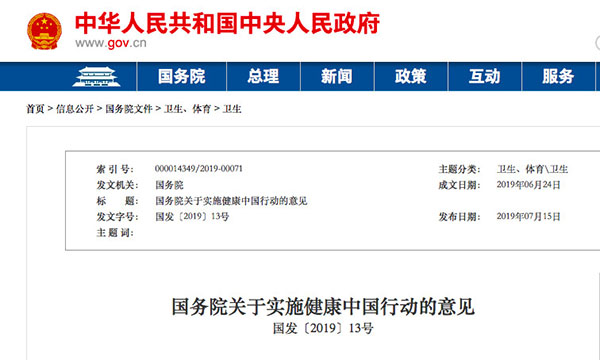 7月15日,國務(wù)院印發(fā)《國務(wù)院關(guān)于實施健康中國行動的意見》(以下簡稱《意見》)。