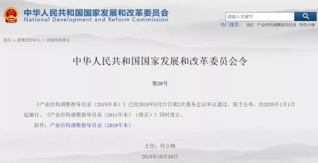 11月6日,國(guó)家發(fā)改委官網(wǎng)發(fā)布《中華人民共和國(guó)國(guó)家發(fā)展和改革委員會(huì)令》(第92號(hào)),《產(chǎn)業(yè)結(jié)構(gòu)調(diào)整指導(dǎo)目錄(2019年本)》(簡(jiǎn)稱《產(chǎn)業(yè)目錄》)獲得審議通過(guò),正式予以公布。