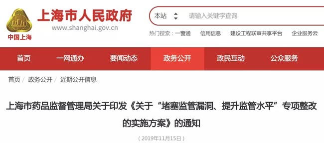 11月15日,上海市人民政府官網(wǎng)掛了一則上海市藥監(jiān)局《關(guān)于“堵塞監(jiān)管漏洞、提升監(jiān)管水平”專項(xiàng)整改的實(shí)施方案》《以下簡稱《方案》)。
